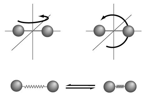 Now picture a diatomic molecule, such as O2. In the terminology of kinetic theory, a diatomic molecule possesses more degrees of freedom than a single atom. O2 can have vibrational and rotational motions as well as translational motion. Heat flow into the sample causes the average translational energy to increase, but it also causes the energy associated with vibrational and rotational motion to increase. The oxygen gas will require a higher energy input to change the temperature by a certain amount. It would take a lot of energy before any one partition would become vigorous. In other words, O2 has a higher molar heat capacity than a monatomic gas such as helium.