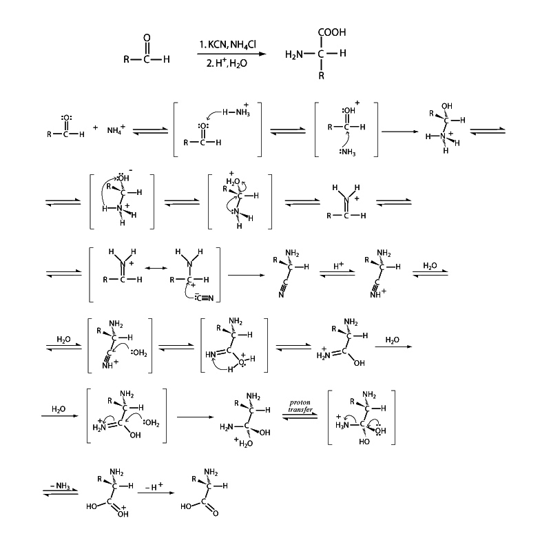 The Strecker amino acid synthesis employs an aldehyde substrate for the synthesis of an α-amino acids. Ammonia serves as the amine precursor in the synthesis and cyanide as the carboxyl precursor. The first step involves nucleophilic addition of ammonia to the aldehyde to form an imine. Next, reaction of the imine with a cyanide nucleophile is carried out to form an α-aminonitrile. Subsequent hydrolysis of the nitrile group of the α-aminonitrile transforms it into the carboxyl group of the finished α-amino acid.The traditional Strecker synthesis yields a racemic mix-ture of L- and D- amino acids, but several procedures utilizing asymmetric catalysts have been developed.