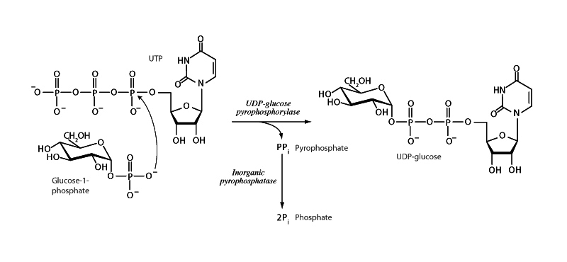 UDP-glucose pyrophosphorylase catalyzes the reaction of UTP and glucose-1-phosphate. A phosphoryl oxygen of glucose-1-phosphate attacks the α phosphorus of UTP along the in-line phosphoryl transfer pathway to form a new phosphoanhydride linkage while releasing pyrophosphate. Because this reaction is merely a phosphoanhydride exchange, there is not much to push this reaction forward thermodynamically. However, the pyrophosphate formed will be subsequently cleaved by the omnipresent enzyme, inorganic pyrophosphatase. Pyrophosphate cleavage is a highly exergonic process. Subsequent breakdown of pyrophosphate drives the reactions forward involving alpha-beta cleavage of nucleoside triphosphates.