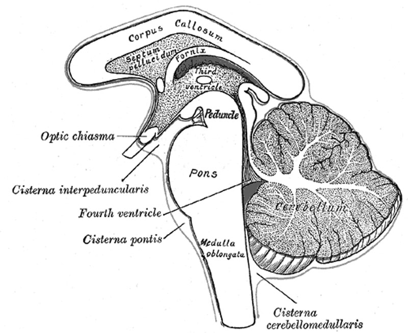 - The hindbrain or rhombencephalon includes the medulla, pons, and cerebellum. Together they support vital bodily processes.